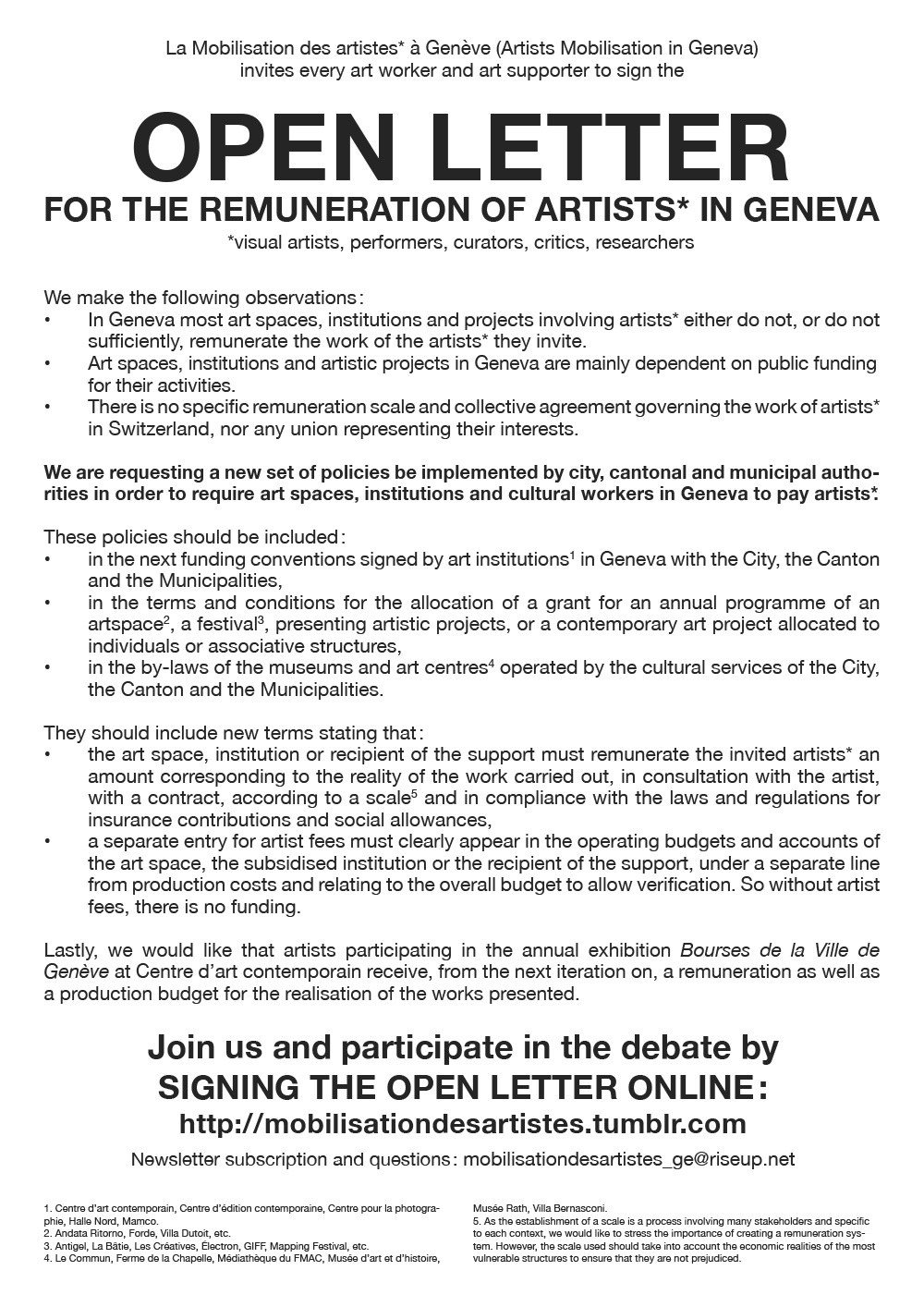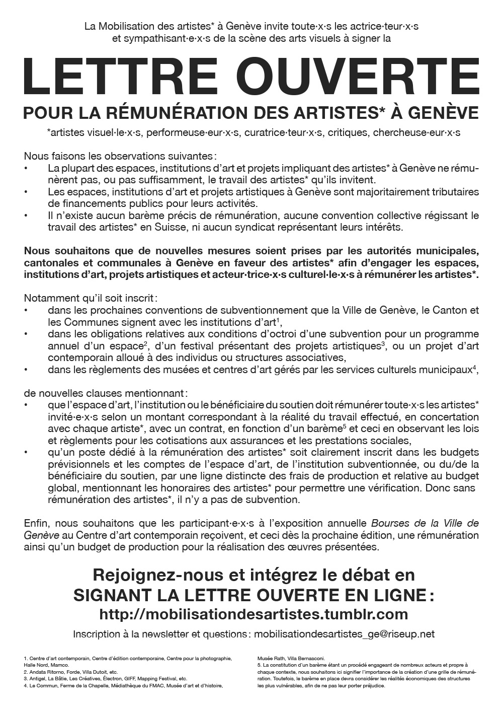 La Mobilisation des artistes* à Genève (Artists Mobilisation in Geneva) invites every art worker and art supporter to sign the