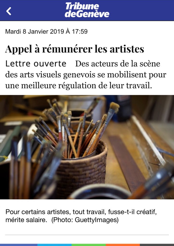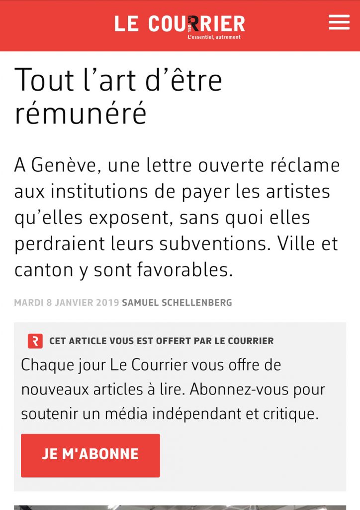 Aujourd’hui, grâce à différentes initiatives, le sujet rencontre un écho grandissant. Le quotidien d’information genevois Le Courrier nous a indiqué que l’article le plus lu en 2017 sur lecourrier.ch, toutes catégories confondues, est l’article Faut-il payer les artistes? (Emmanuelle Fournier-Lorentz, 25 août 2017). L’enquête plus récente de Samuel Schellenberg #PaieTonArtiste (28 mars 2018) est à ce jour le 4e article le plus lu sur leur site internet en 2018. On y apprend que les lignes sont en train de bouger. La fondation suisse pour la culture Pro Helvetia affirme qu’il s’agit d’un sujet important et nécessaire et le définit comme une priorité pour elle. À Genève, le Centre d’art contemporain, Forde et Zabriskie Point ont modifié leur politique et rémunèrent les artistes* avec lesquel·le·x·s elles travaillent. Mais les montants proposés restent symboliques et ne correspondent ni au temps ni au travail qu’un·e·x artiste* fournit. Dans la plupart des cas, ces relations de travail ne sont pas formalisées par des contrats, de sorte que les artistes* ne peuvent pas se défendre. De plus, les artistes* ne sont pas embauchés temporairement par l’institution, ainsi leurs cotisations aux assurances sociales ne sont pas payées si elles/ils/x ne sont pas indépendant·e·x·s. Par ailleurs, si la direction de ces espaces et institutions d’art change, il n’y a aucune garantie que la rémunération des artistes* y sera assurée.