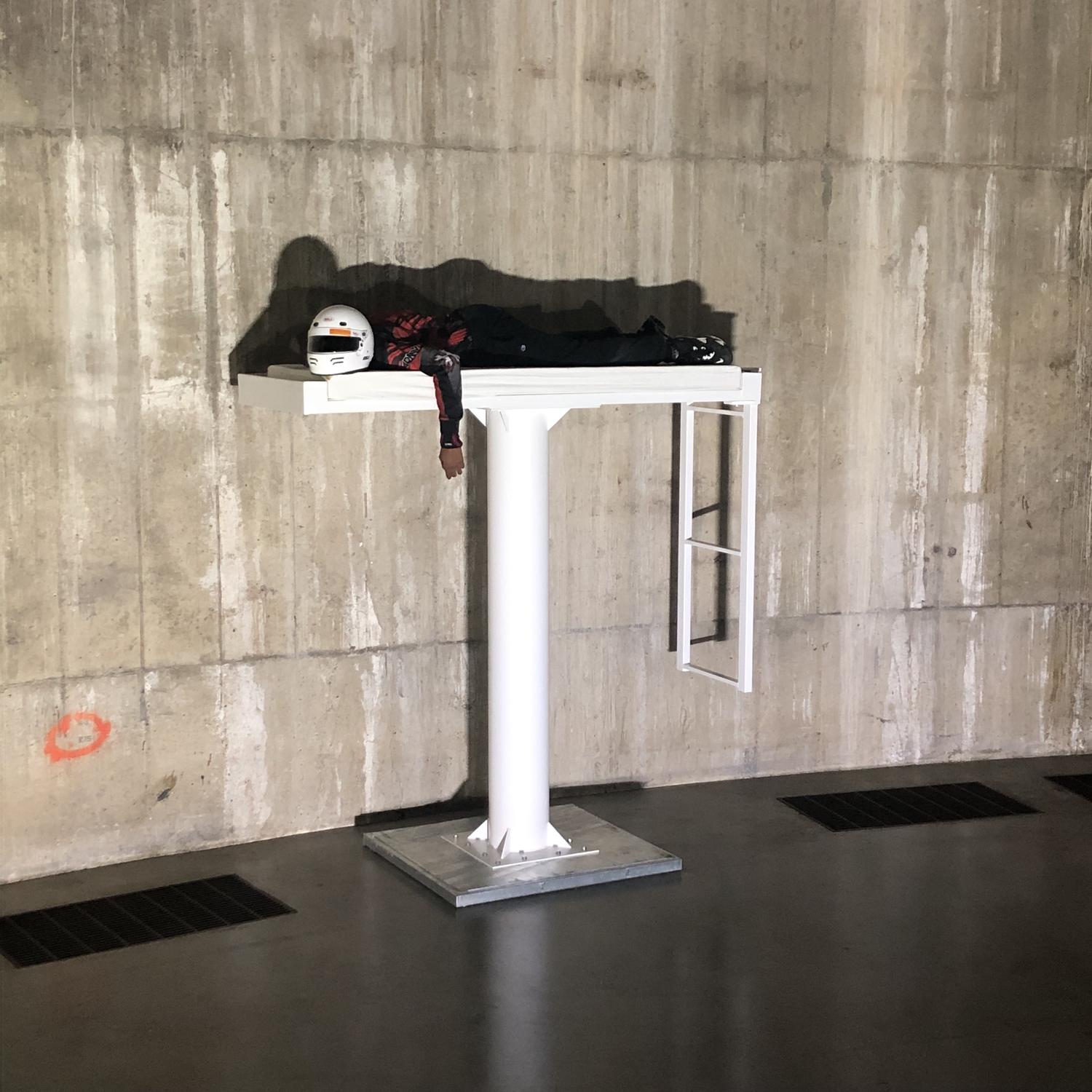 Cela conduit naturellement à s’interroger sur les croyances qui sous-tendent de telles performances. Il y a tant de choses à remettre en question, tant de tropes auxquels se frotter. L’aspect léché et fuselé de certains éléments de l’installation (les rambardes et les plateformes aux allures de plongeoirs), en tension avec la souillure et dégradation de certains autres (la moquette et la structure en bois du quai), mettent en scène l’élixir parfait pour le public bien avisé de l’art contemporain (également incarné par l’architecture des Tanks et ses finitions) : raffiné, avec ce qu’il faut d’aspérité. En fin de compte, c’est ce que reflètent les performeur·euse·s : leur beauté corrompue et sans sourire ne survit que dans leurs indécisions (tout comme nous, qui les regardons) et caractères insaisissables (leurs genres et leurs âges sont sujets à débat), perdus et punis : certains vont, de temps à autre, se cacher dans les coins du salon. Ça me rappelle l’autoportrait de Martin Kippenberger: Martin, ab in die Ecke und schäm Dich (Martin, Au coin, tu devrais avoir honte), 1989 (pour la première version de l’œuvre).
