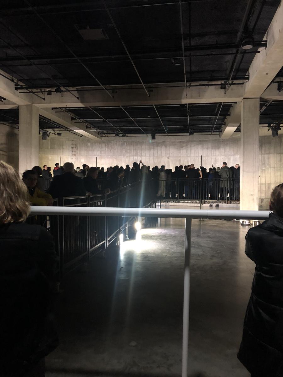 L’une des interprètes d’Anne Imhof, Eliza Douglas, est en chemin de la plateforme au salon (et doit donc passer par le quai), mais se fait arrêter par le personnel de sécurité. Important : bien que les trois espaces communiquent, seul·e·s les artistes peuvent se déplacer d’un espace à l’autre via leurs portes communes. Le personnel est majoritairement (pour ne pas dire entièrement) noir, tandis que le casting de performeur·euse·s est majoritairement blanc. C’est quelque chose qui vaut la peine d’être remarqué parce que le personnel de sécurité (qui doit en permanence empêcher le public de passer), devient intrinsèquement et inévitablement partie intégrante du spectacle.