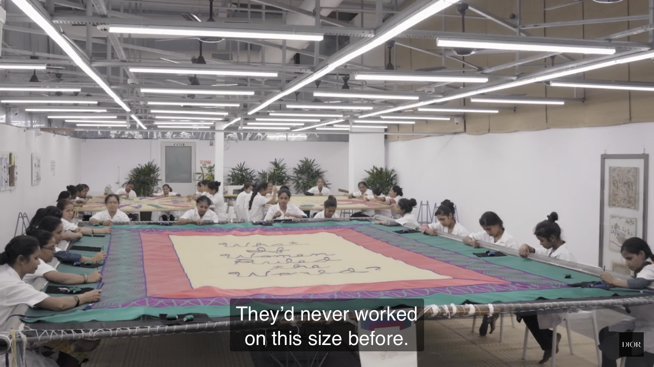 La vidéo postée sur la page YouTube de Dior donne à voir un atelier à taille modeste. Le site Outlook India précise néanmoins que le projet a nécessité 150 “étudiantes” qui sont seulement payées un “honoraire” dont le montant n’est pas dévoilé et que chaque bannière a demandé entre 500 et 2800 heures de travail.