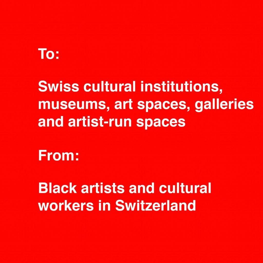 Nous supposons qu’en publiant un carré noir ou un contenu comparable, vous vouliez signifier que votre institution condamne les pratiques racistes. Nous vous interpellons donc sur ce point: Nous vous demandons maintenant de prendre vos responsabilités, de passer à l’action, et ceci au-delà de la vitrine des réseaux sociaux, de mettre en pratique des changements concrets et significatifs, ainsi que de vous engager d’une manière exemplaire dans la lutte contre le racisme dans les milieux artistiques et culturels en Suisse.
