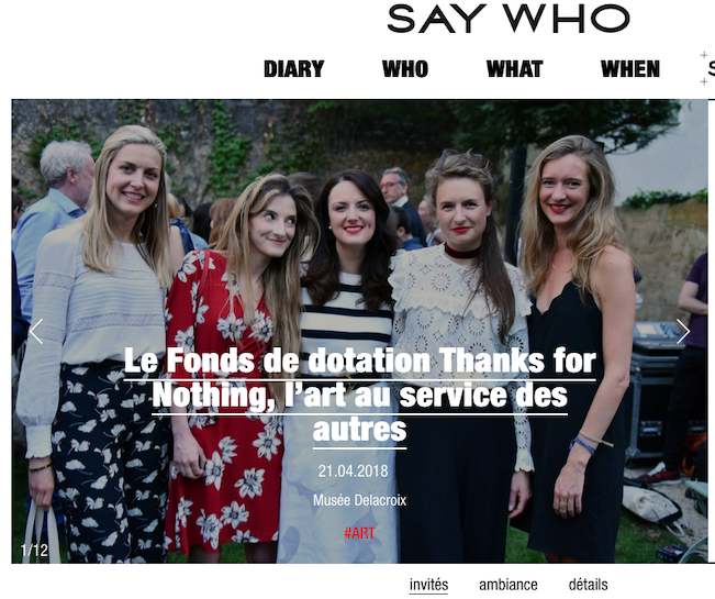 Depuis trois ans, Thanks for Nothing fait partie de l’écosystème de l’art contemporain français. Créé en 2017 par Marine Van Schoonbeek (ancienne directrice de la Galerie Chantal Crousel), Blanche de Lestrange (directrice adjointe de la FIAC), Anaïs de Senneville (responsable de la programmation des Amis du Musée d’Art moderne de la Ville de Paris), Bethsabée Attali (directrice de projet) et Charlotte von Stotzingen (directrice du Zürich Art Weekend et co-fondatrice de Startup Lions), cette « plateforme  philanthropique » a pour but, d’après son site internet , de « concevoir des formats innovants d’événements culturels et solidaires ». Elle souhaite lier l’art contemporain et un « engagement social concret » à travers différentes formes d’actions : expositions, ventes aux enchères, événements, conférences … Les trois axes directeurs des actions de l’association sont énoncés comme « la défense des droits humains, l’éducation et la protection de l’environnement ».