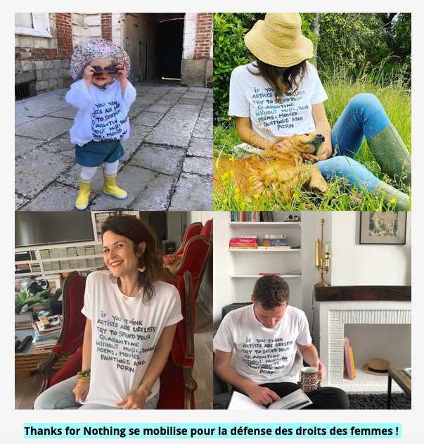 Thanks for Nothing s’engouffre complètement dans cette confusion. Elle n’est pas une association qui agit directement sur le terrain, mais joue un rôle de support (de « plateforme philanthropique ») dans le but de monter des projets artistiques associant des projets artistiques et solidaires. On peut interroger l’efficacité de cet enrobage artistique, les actions mises en avant par l’association semblent plus symboliques qu’autre chose, et reprennent souvent les poncifs du genre. Par exemple, le fameux « pour un X, un arbre planté » (dans le cas de Thanks for Nothing, vous pouvez remplacez X par « participant à la performance du Troisième Paradis », mais de nombreuses variations existent « un achat », « une recherche », « 1 euro » …), ou encore les tee-shirts « solidaires ». Depuis des décennies, on nous vend des tee-shirts marketés « solidaires » avec des beaux messages dessus. Au cours de ma vie j’ai acheté un nombre incalculable de tee-shirts qui devaient aider à changer le monde. Je pense qu’on peut se permettre d’affirmer une seule chose à ce sujet : on ne change pas le monde avec des tee-shirts. Pourtant, en avril 2020, Thanks for Nothing commercialise un tee-shirt solidaire pour la défense des droits des femmes, et notamment pour soutenir les femmes confinées victimes de violences conjugales. Ce projet est porté avec les commissaires Lucia Pietroiusti et Asli Samadova et l’artiste Alex Cecchetti1717.Deux autres tee-shirts ont depuis été produits avec Laure Prouvost et Ariana Reines qui le décrit en ses termes : « Ce projet vient tout juste d’être créé en cette période d’urgence avec une forte pression émotionnelle. Nous souhaitons agir rapidement et être aussi efficaces qu’un haïku : en allant droit au but et là où cela est nécessaire. Mais tout ce que nous pourrons faire dépendra aussi beaucoup du soutien de chacun d’entre vous. Alors, ensemble aidons la poésie à sauver des vies1818. Voir le site internet de Thanks for Nothing ». À l’heure où de nombreux syndicats interpellaient les pouvoirs publics sur la nécessité de fermer les industries non prioritaires pour ne pas exposer les travailleur·euse·s et à réduire le plus possible les flux de courrier et de colis, il aurait peut être fallu y réfléchir à deux fois avant de lancer la production d’un tee-shirt dans le pays le plus touché d’Europe par le Covid-19, le Royaume-Uni.