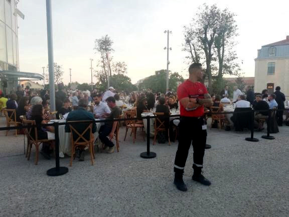 Un dîner avait lieu pour l’ouverture de la Fondation LUMA, les riches invité·es pouvaient manger sur le parvis devant la tour, dans l’espace public qui avait été privatisé pour l’occasion.