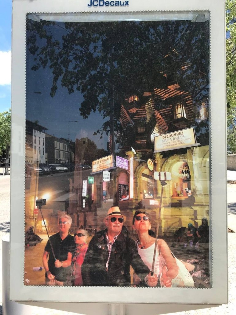En se promenant autour de la tour, on pouvait apercevoir une drôle d’affiche dans un panneau publicitaire, en fait un habile photomontage : des touristes armé·es de selfie sticks se tirant le portrait devant les Arènes d’Arles, transformées en galerie marchande et surplombées par la Tour Luma.